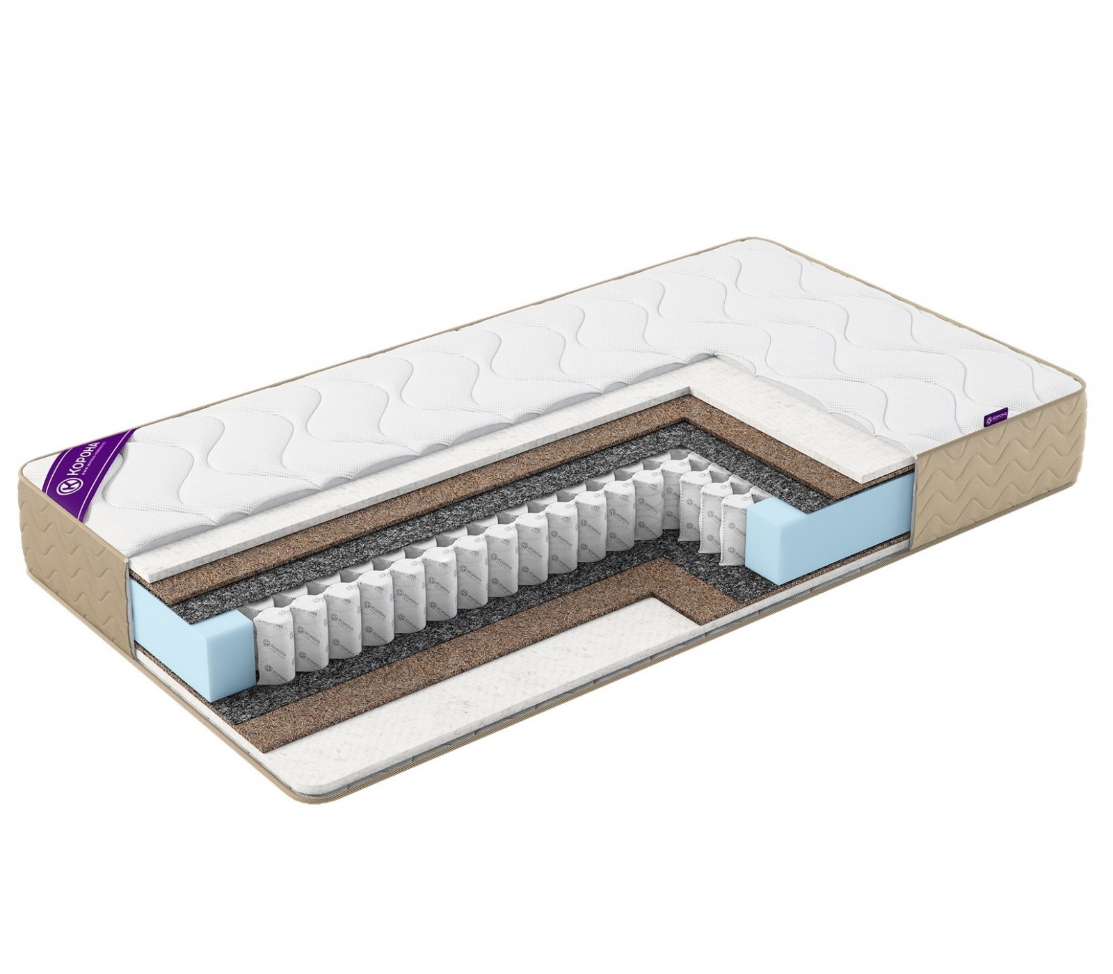 Комфортный матрас средней жесткости на основе блока независимых пружин равномерно распределяет нагрузку по всей поверхности и обеспечивает поддержку позвоночника. В качестве наполнителя используется натуральное латексированное кокосовое волокно и струттофайбер, придающий комфорт.