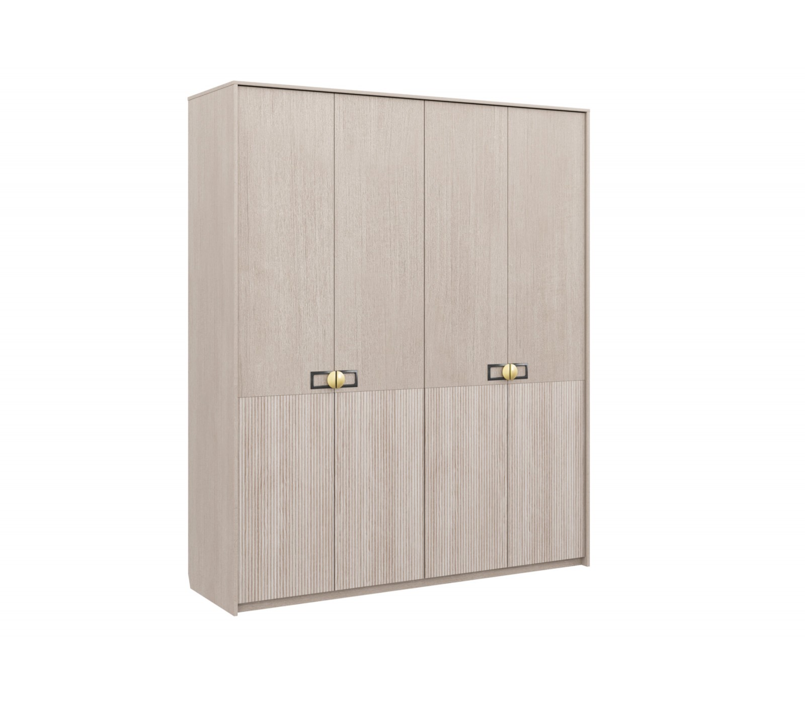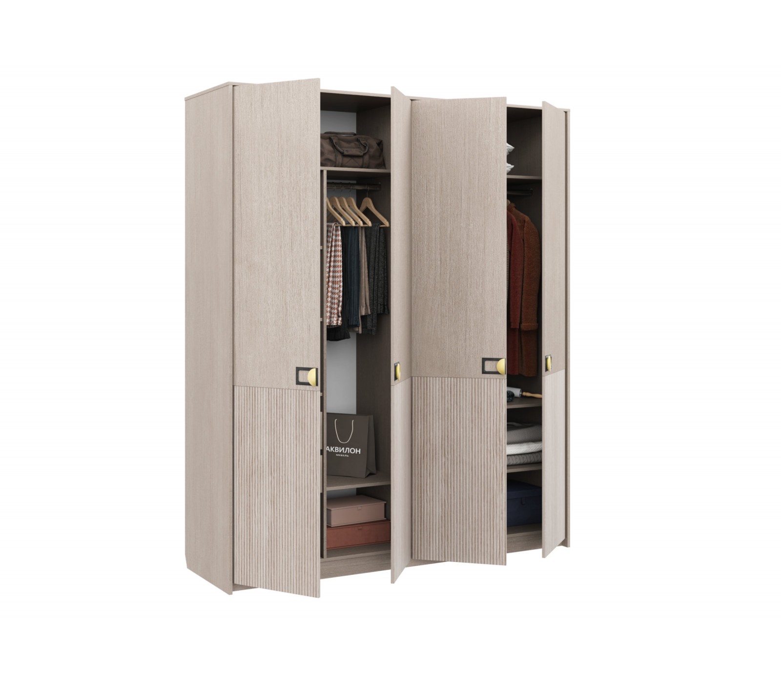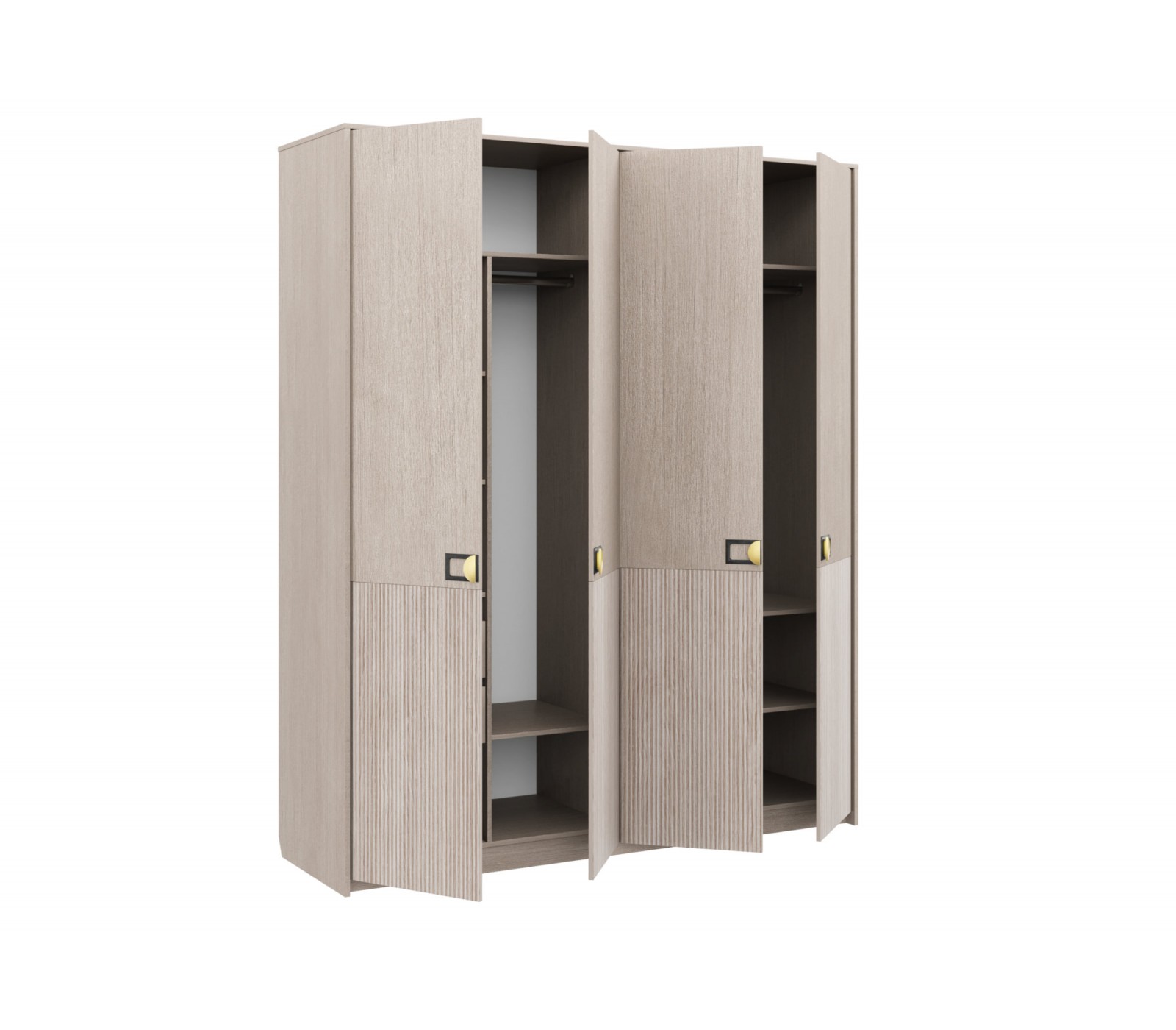Шкаф распашной четырехдверный с выдвижными ящиками стоит на подпятниках. Петли плавного закрывания. Фурнитура ящиков скрытая нижнего крепления. Ручка матовая золото/черный цвет. Декоры Тира/Кадена вуд.