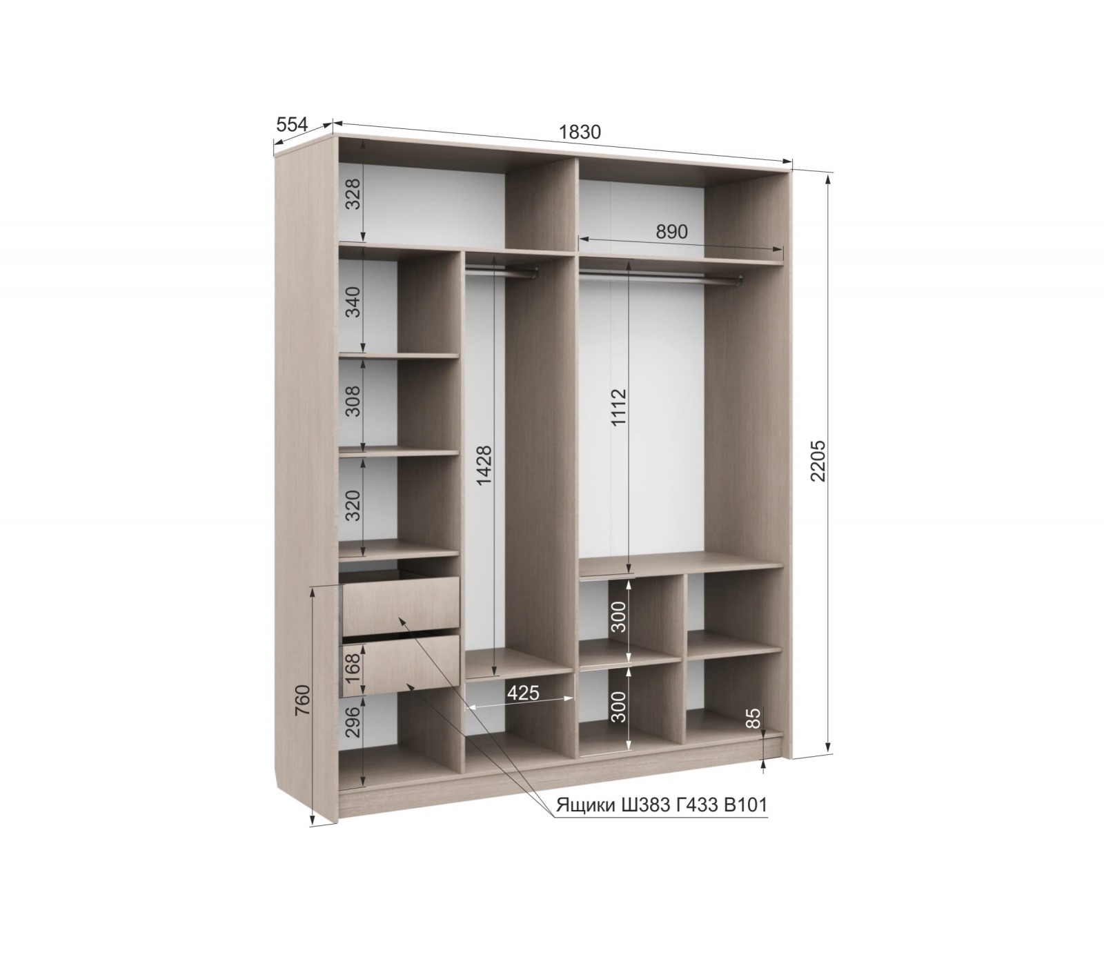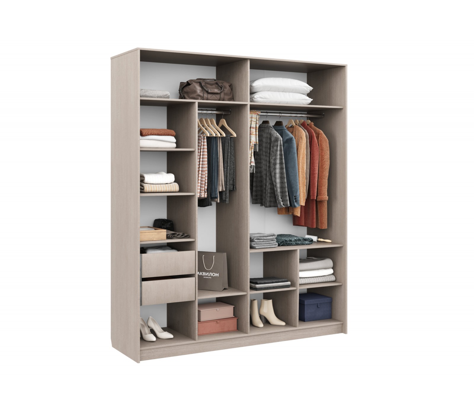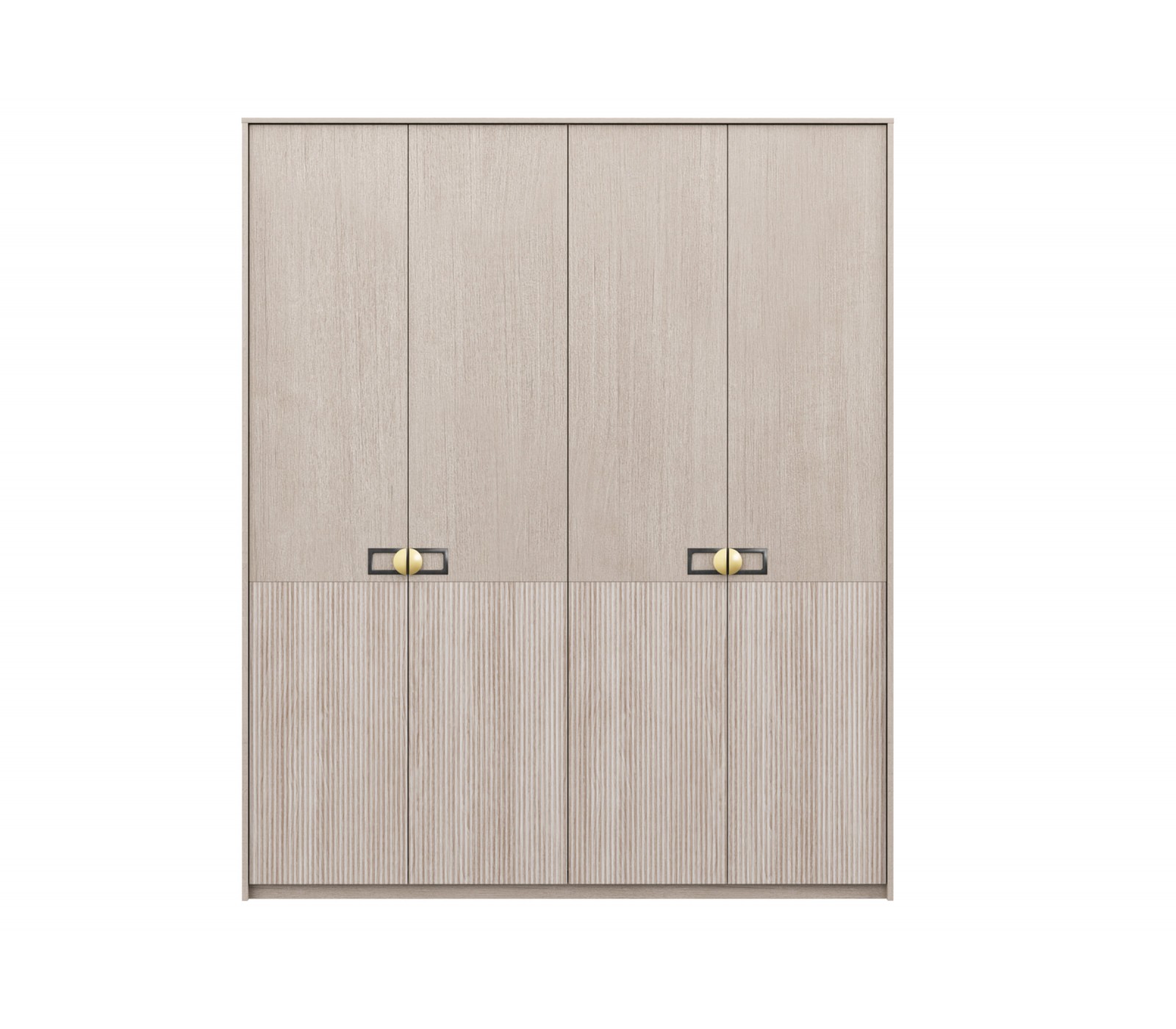 Шкаф распашной четырехдверный с выдвижными ящиками стоит на подпятниках. Петли плавного закрывания. Фурнитура ящиков скрытая нижнего крепления. Ручка матовая золото/черный цвет. Декоры Тира/Кадена вуд.