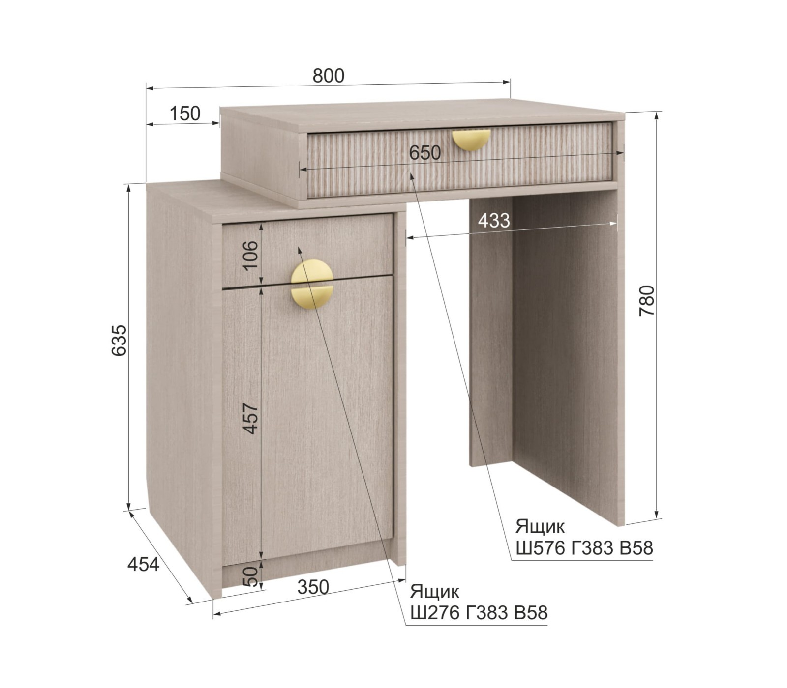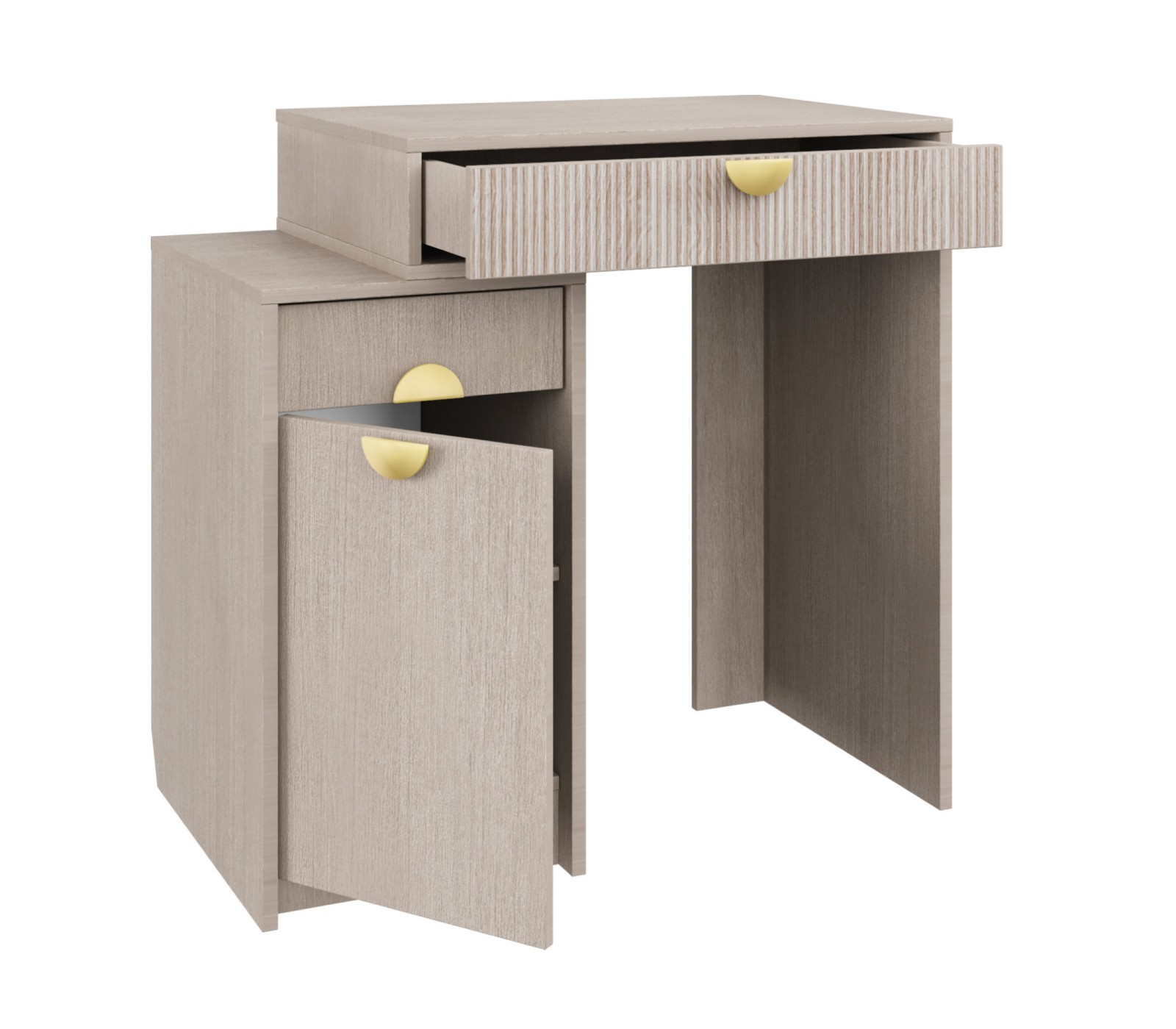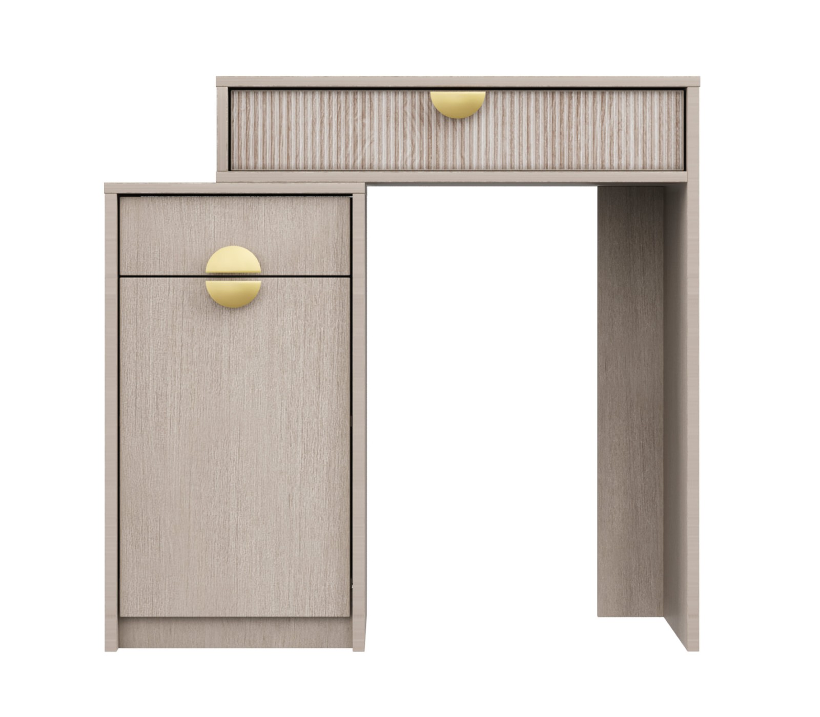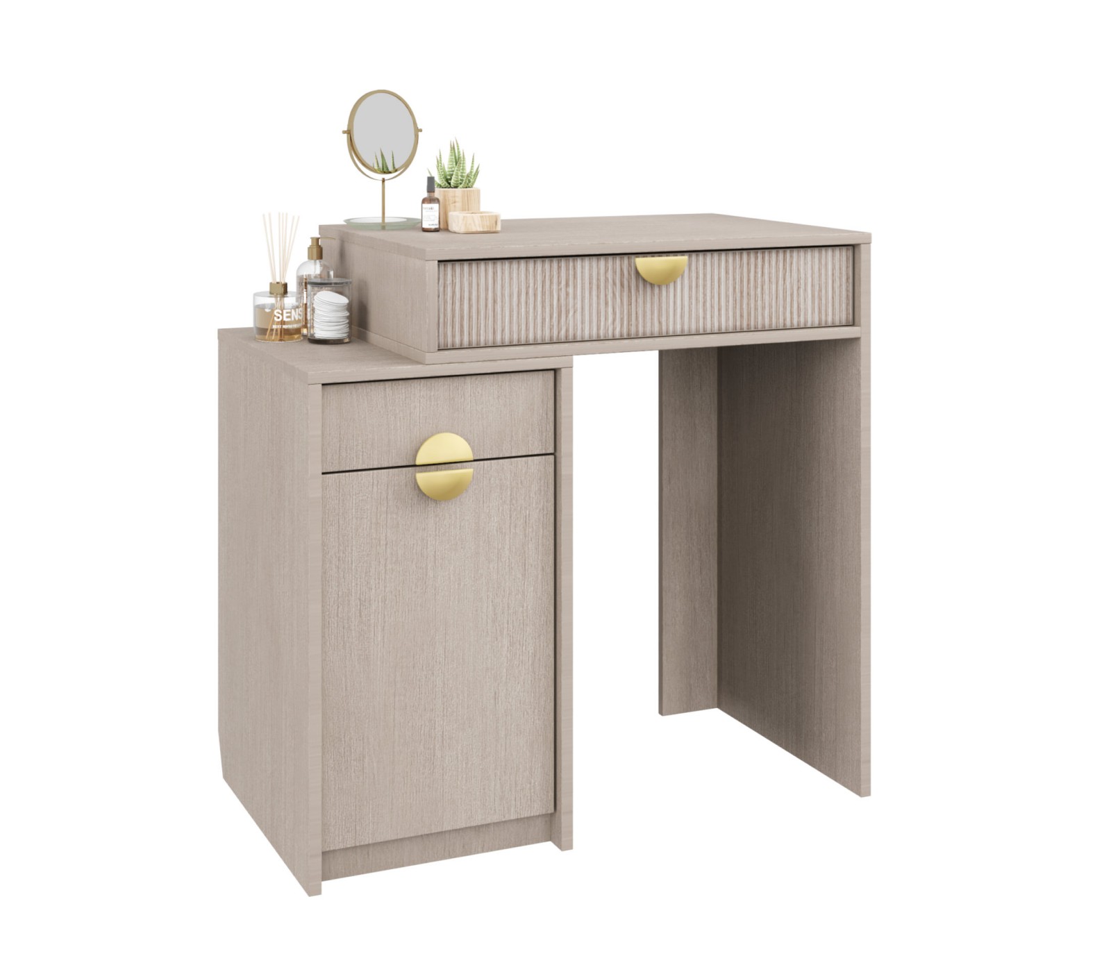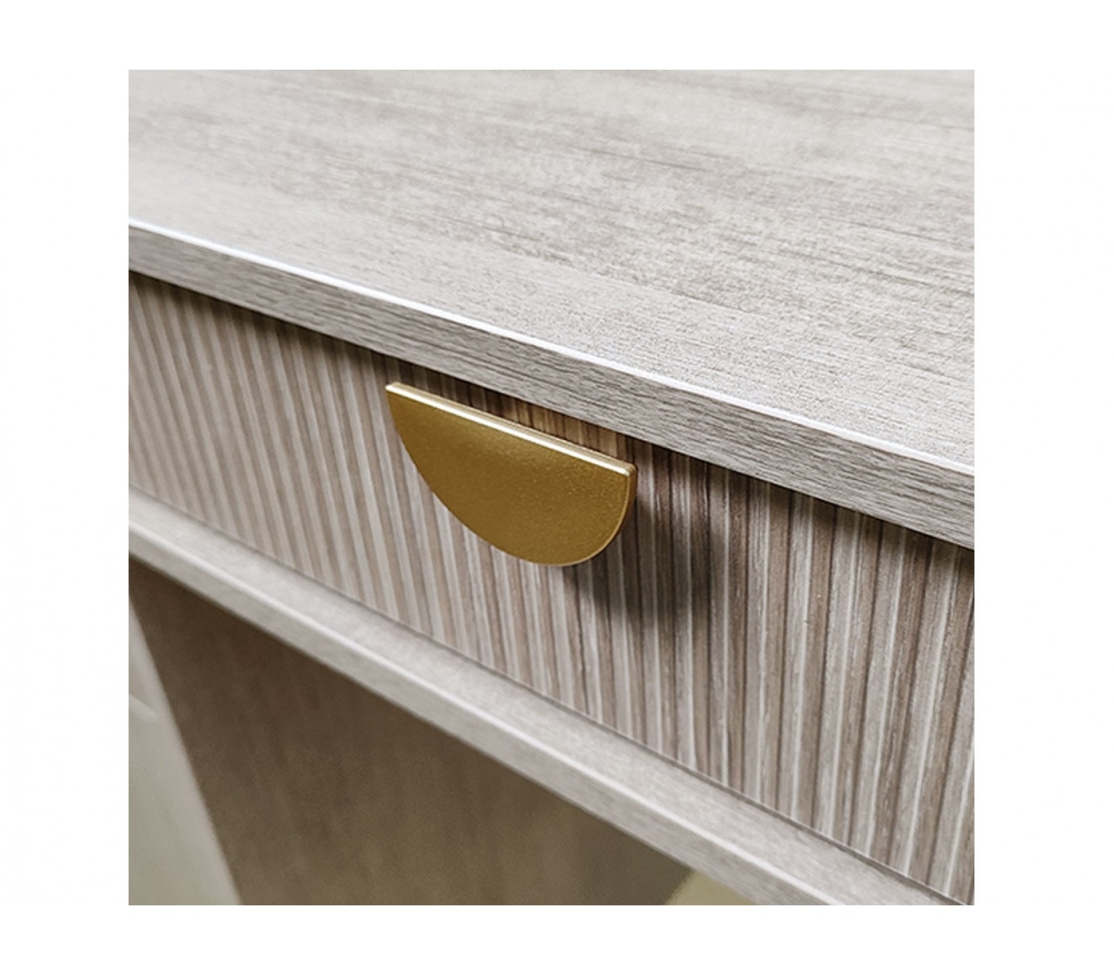 Корпус ЛДСП 16. Фасады рифленые. Ручка матовое золото. У ящика фурнитура скрытая плавного закрывания с нижним креплением. Можно дополнить зеркалом и использовать как туалетный столик Муза.